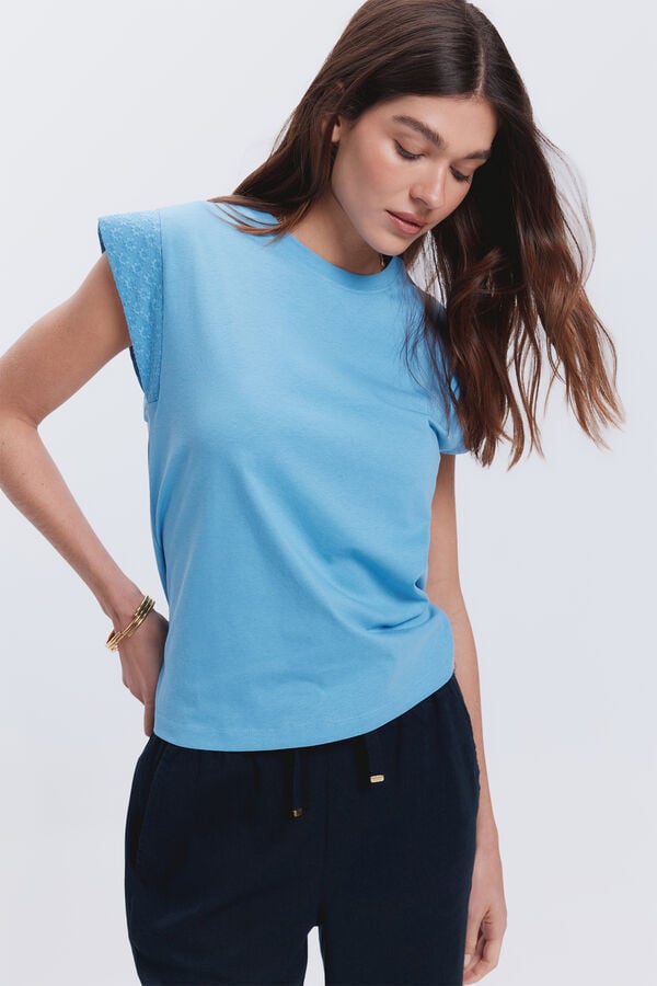 Camiseta confeccionada en algodón BCI. Cuello caja. Manga sisa con detalle de pieza bordado floral a tono.